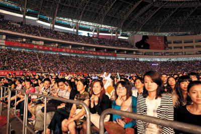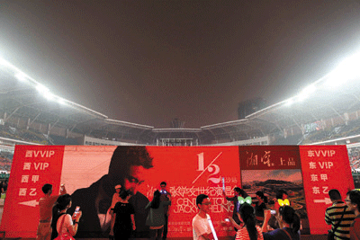 贺龙体育场座无虚席,四万多名观众“品湘窖、听经典、回味如歌岁月”。
