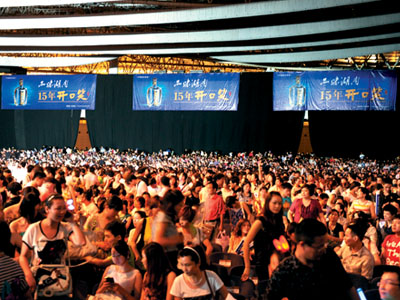 场内的大屏幕滚动播放湘窖酒业70秒宣传片和30秒的开口笑广告片,为演出暖场。演出场地的左、右、后三侧,都悬挂着醒目的开口笑广告。观众开玩笑说,一会儿王菲站在台上,满眼都是开口笑,会不会晕呀?