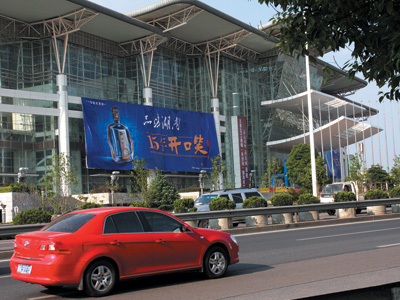 湖南国际会展中心周边地形复杂,一些第一次来的人难免找不着北,问路,对方往前一指,“那个挂了开口笑酒广告的就是。”
