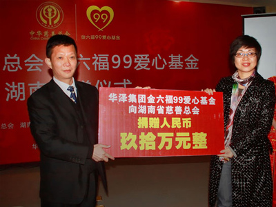 多年来,集团始终将“回馈社会、造福人民”作为最重要的价值理念之一,致力于开展各项慈善公益、扶贫救灾活动,并设立见义勇为奖励基金。为了持续地为国家的扶贫济困、文化体育和支援灾区等各项公益事业做出积极贡献,为社会倡导和传播更多的“福”音,2008年,集团联合中华慈善总会,成立了“中华慈善总会·金六福99爱心基金”。