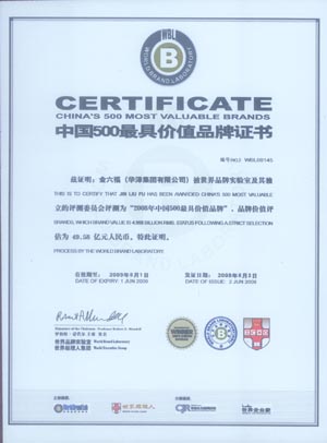2008年6月2日, 由权威品牌评审机构——世界品牌实验室(World Brand Lab)主办的2008(第五届)《中国500最具价值品牌》在北京揭晓。我集团“金六福”品牌再次入选,品牌评估价值为49.58亿元人民币,名列食品、饮料行业第15位。 此次品牌评估基于财务分析、消费者行为分析和品牌强度分析。自1998年以来,通过持续、系统的品牌打造和销售提升,“金六福”产品知名度、美誉度和消费者认可度的得到不断加强,销售业绩实现较好增长,十年间品牌的宣传和推广费用累计投入已经超过60亿元。在之前的一份由BBI商务品牌战略研究所、国际广告杂志社、中国传媒大学广告学院共同发起的权威调查研究显示,金六福品牌位列2008消费者白酒品牌选择排名前三甲。 通过多年的持续打造和品牌积累,金六福品牌已深入人心,品牌价值已从05年的33.48亿元攀升至今年的49.58亿元。 |