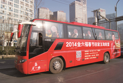 1月22日,春运开始的第七天,一辆特殊的大巴引起人们的关注。这辆开往邢台的大巴,是王宝强为帮助邢台老乡春节回家,联合2014金六福春节回家互助联盟特意打造的“春节回家互助联盟号”。车头醒目的大红花、车身大红的喜庆装扮、车窗粘贴的中国结以及车内50张洋溢着幸福的笑脸,成为春运回家路上一道靓丽的风景。