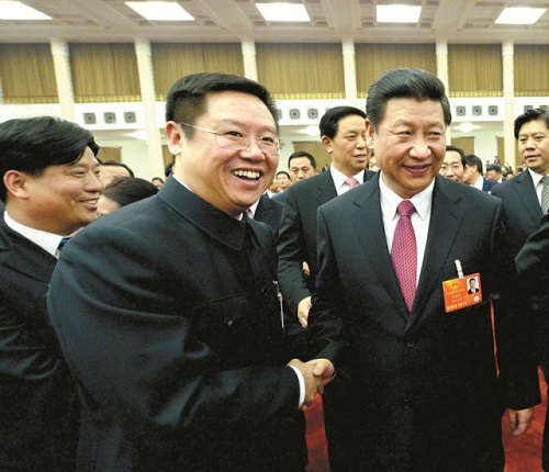 2013年两会期间,习近平与全国人大代表、华泽集团董事长、华致酒行董事长吴向东亲切握手。